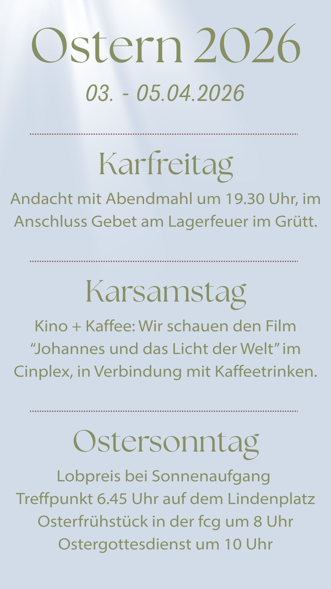 An Karfreitag findet um 19.30 Uhr eine Andacht mit Abendmahl statt. Im Anschluss laufen wir ins Grütt, um dort am Lagerfeuer gemeinsam zu beten.